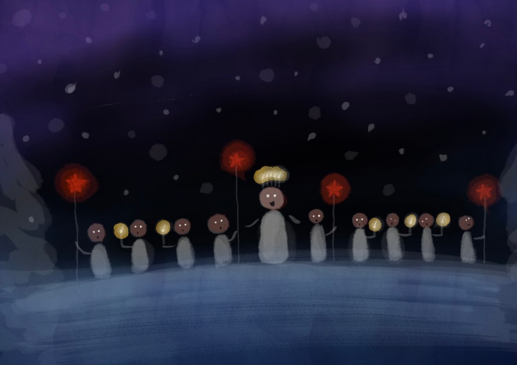For meg er det ikke søtt at barna gjør det, men en varsom opplæring i å spre lys. Det er viktig å ta vare på alle muligheter til å lære videre alle synlige og praktiske verktøy som legger vekt på at det er noe vi kan gjøre når natten er mørk og stum, når vår tids skygger truer. Vi kan dele lys, vi kan være den Lucia som går først og gir de små noen å følge etter. Vi kan etterhvert lene oss tilbake, trygge på at vi har delt og at noen står klare til å dele videre.
